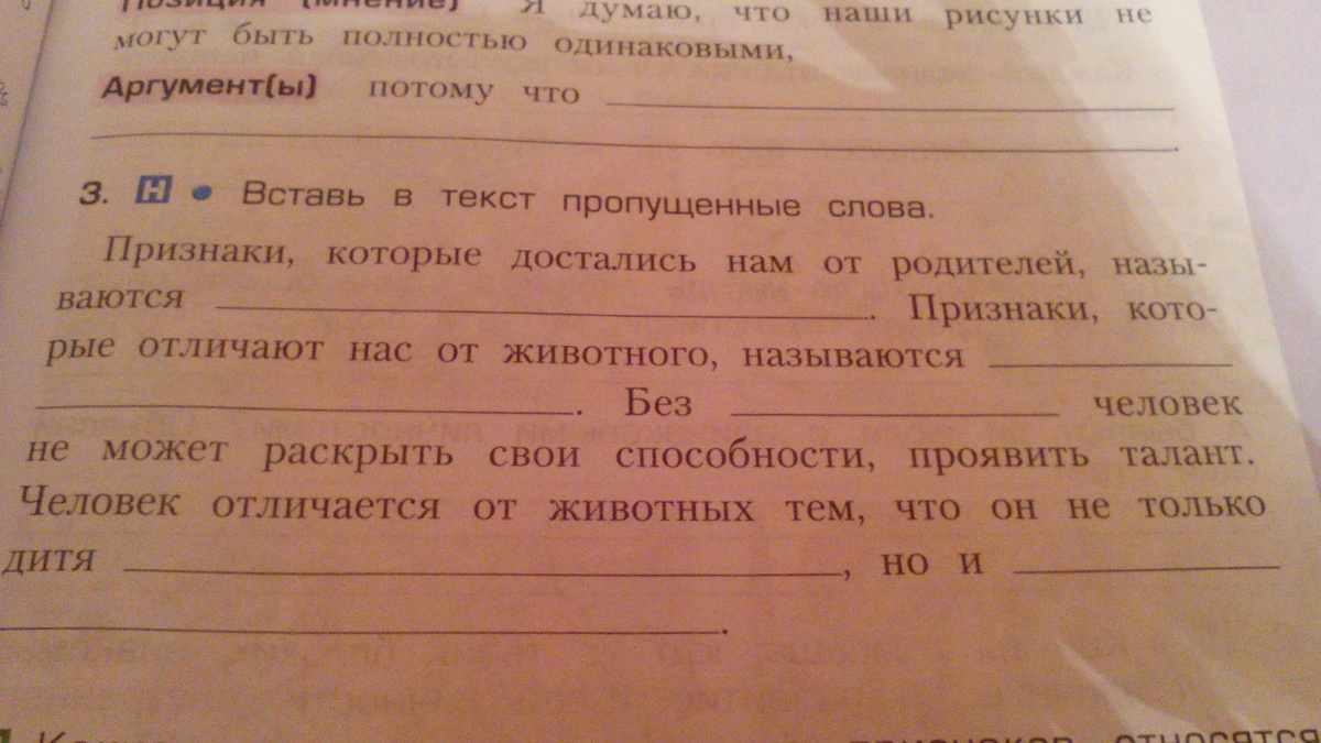 Признаки,которые достались нам от родителей называются врожденными. Признаки,которые отличают нас от животного называются приобретенными. Без общества человек не может раскрыть свои способности, проявить талант. Человек отличается от животных тем, что он не только дитя человека, но и общества.