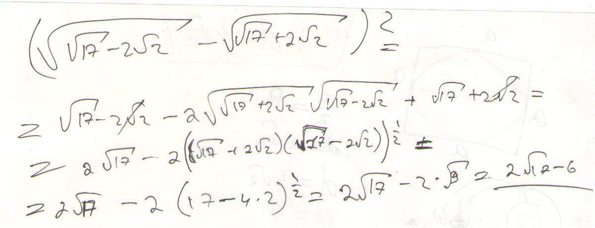 [√(√17 - 2√2) - √(√17 + 2√2)] ² = √17 - 2√2 - 2√(√17 - 2√2) * √(√17 + 2√2) +