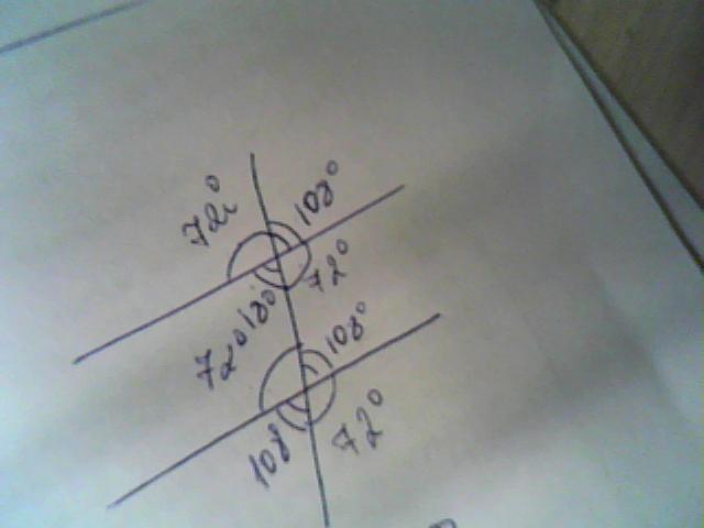 Один из углов которые получаются при пересечении двух параллельных прямых секущей равна 72 градуса найдите остальные семь углов