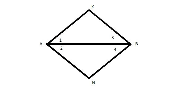 По разные стороны от прямой AB взяты точки K и N, такие, что AK=BK, AN=BN и угол BAK= углу BAN. Докажите, что треугольники AKN и BKN равны. Если можно пожалуйста с чертежом.