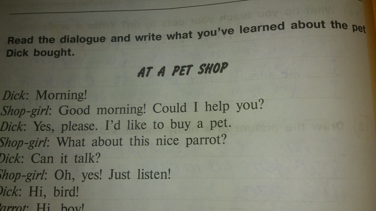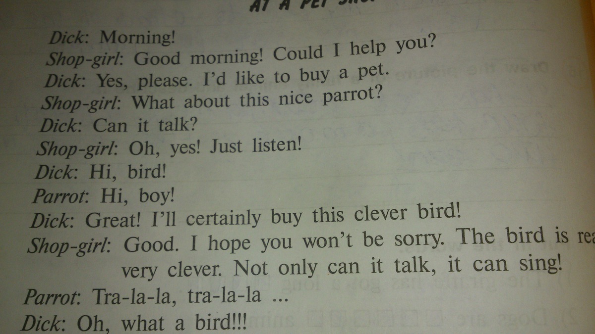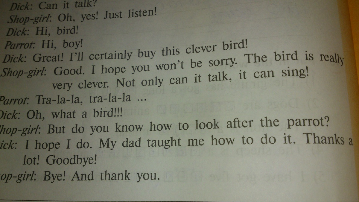 Dick bought a parrot. His parrot is very clever. The parrot can talk like humans and sing.