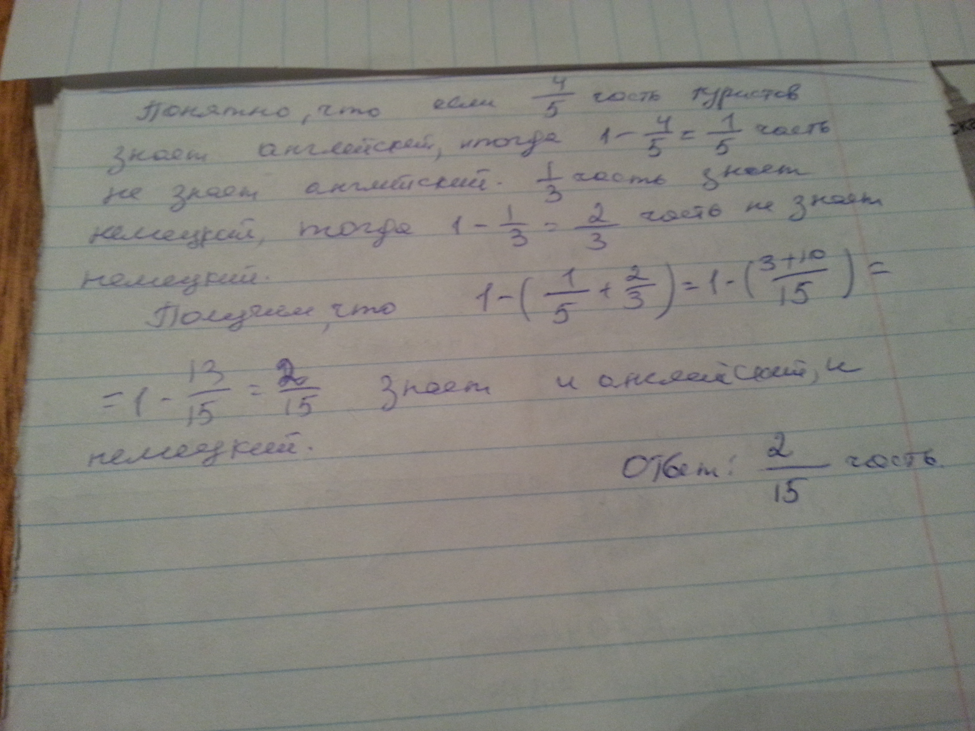В наш город прибыли туристы. Из них 4/5 знают английский, 1/3 -немецкий. Какая часть туристов знают и английский и немецкий языки