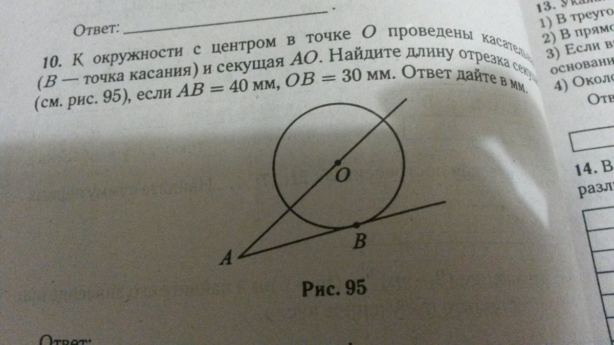 проведены касательная АВ(В-точка касания) и секущая АО. Найдите длину отрезка секущей АО, если AB= 40мм, OB=30мм. Ответ должен быть 50
