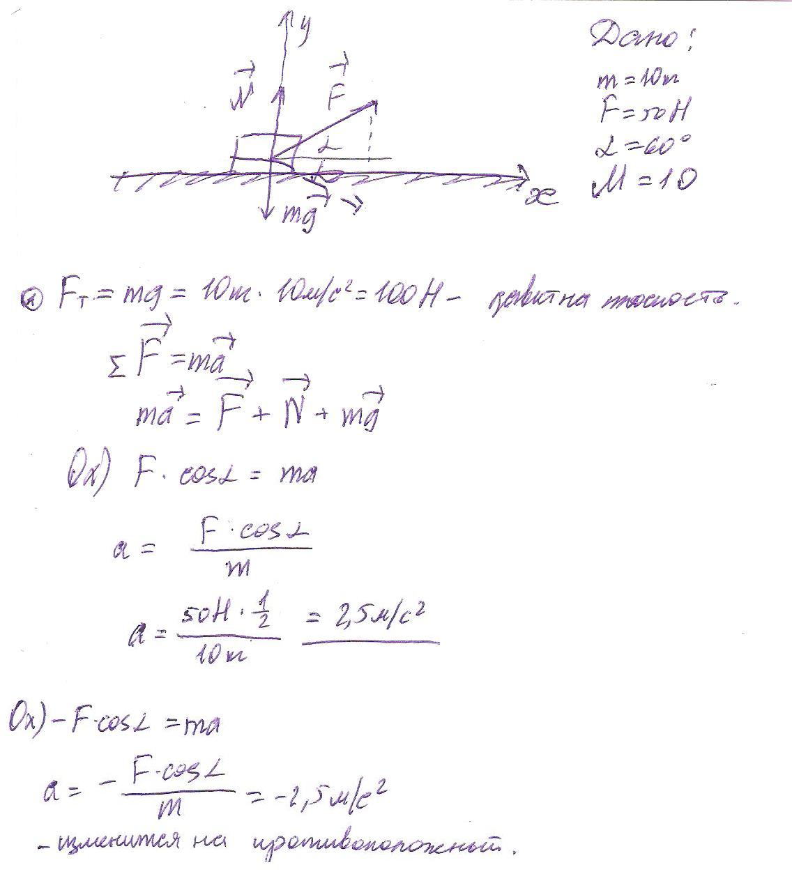 1)По гладкой горизонтальной поверхности движется тело массой 10 кг под действие постоянной силы 50 Н направленной под углом 60 к горизонту вверх. Определите: С каким ускорением движется тело и с какой силой тело давит на плоскость. 2) Как изменится ответ если сила будет направленна под углом 60 к горизонту вниз?
