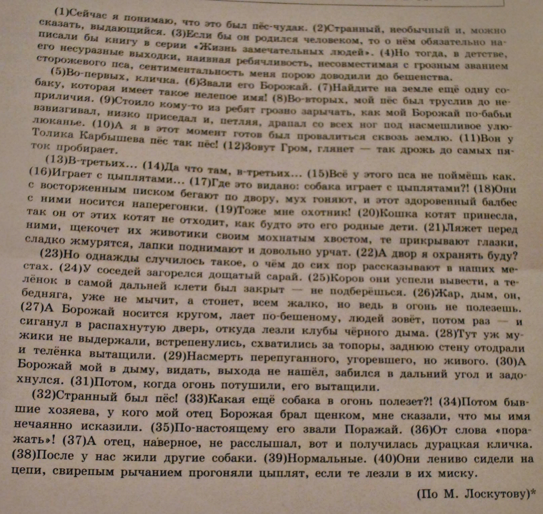 Прочитав предложенный текст, я убедился в справедливости слов известного лингвиста Нины Сергеевны Валгиной которая писала6 «Функция абзаца тесно связаны с функционально- стилевой принадлежностью текста, вместе с тем отражают и индивидуально-авторскую особенность оформления текста» Смысл этих слов я понимаю так. Абзац помогает автору разделять не только микротемы, но и разделять мысли, чтобы не смешать все, ибо тогда текст не будет иметь ни какого смысла, который мог бы понять проницательны человек. Мое рассуждение легко подтвердить примерами из текста Лоскутова Михаила Петровича. Например: первый, четвертый и пятый абзацы гласят о воспоминаниях героя рассказа о его собаке по кличке «Борожай». В второй и третий абзацах указываются повадки собаки. Таким образом, предложенное для анализа высказывание известного лингвиста Нины Сергеевны Валгиной справедливо.
