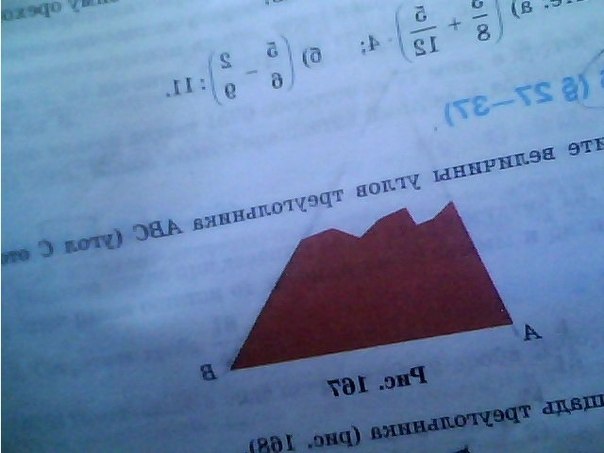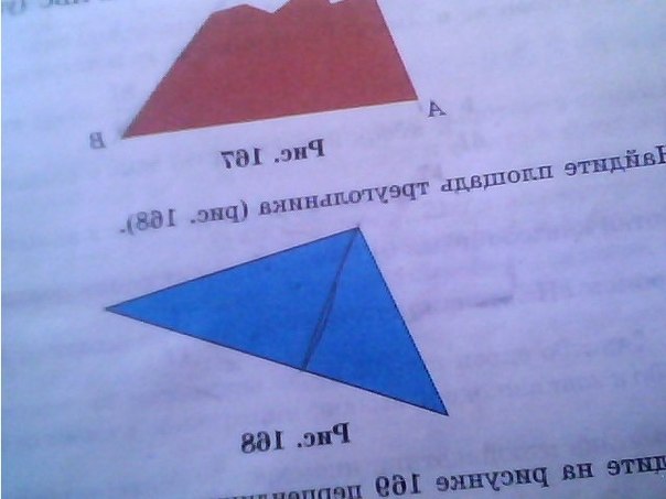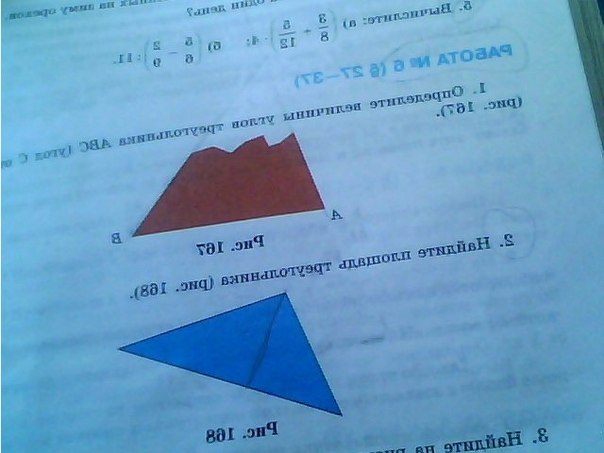 там где красный треугольник - определите величины Углов треугольника А В С ( угол С оторван ) ( рис 167 ) ТАМ ГДЕ СИНИЙ ТРЕУГОЛЬНИК - НАЙДИТЕ ПЛОЩАДЬ ТРЕУГОЛЬНИКА РИС ( 168 ) РЕШИТЕ ПОЖАЛУЙСТА Я НЕ МОГУ ПОНЯТЬ В ИНТЕРНЕТЕ СМОТРЮ А ТАМ ВООБЩЕ ХОТЬ МОЗГ ЛОМИ ! ПОЖАЛУЙСТА КТО НИБУДЬ СЛОМИТЕ СИСТЕМУ И РЕШИТЕ ЭТИ ЗАДАЧИ ИЛИ КАК ИХ НАЗВАТЬ ....