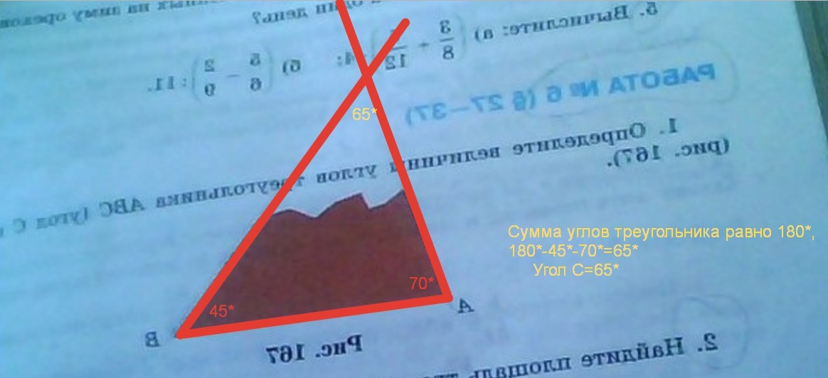 1. Измерение транспортиром видимых углов А и В красного треугольника дает: ∠А=70°, ∠В=45°.