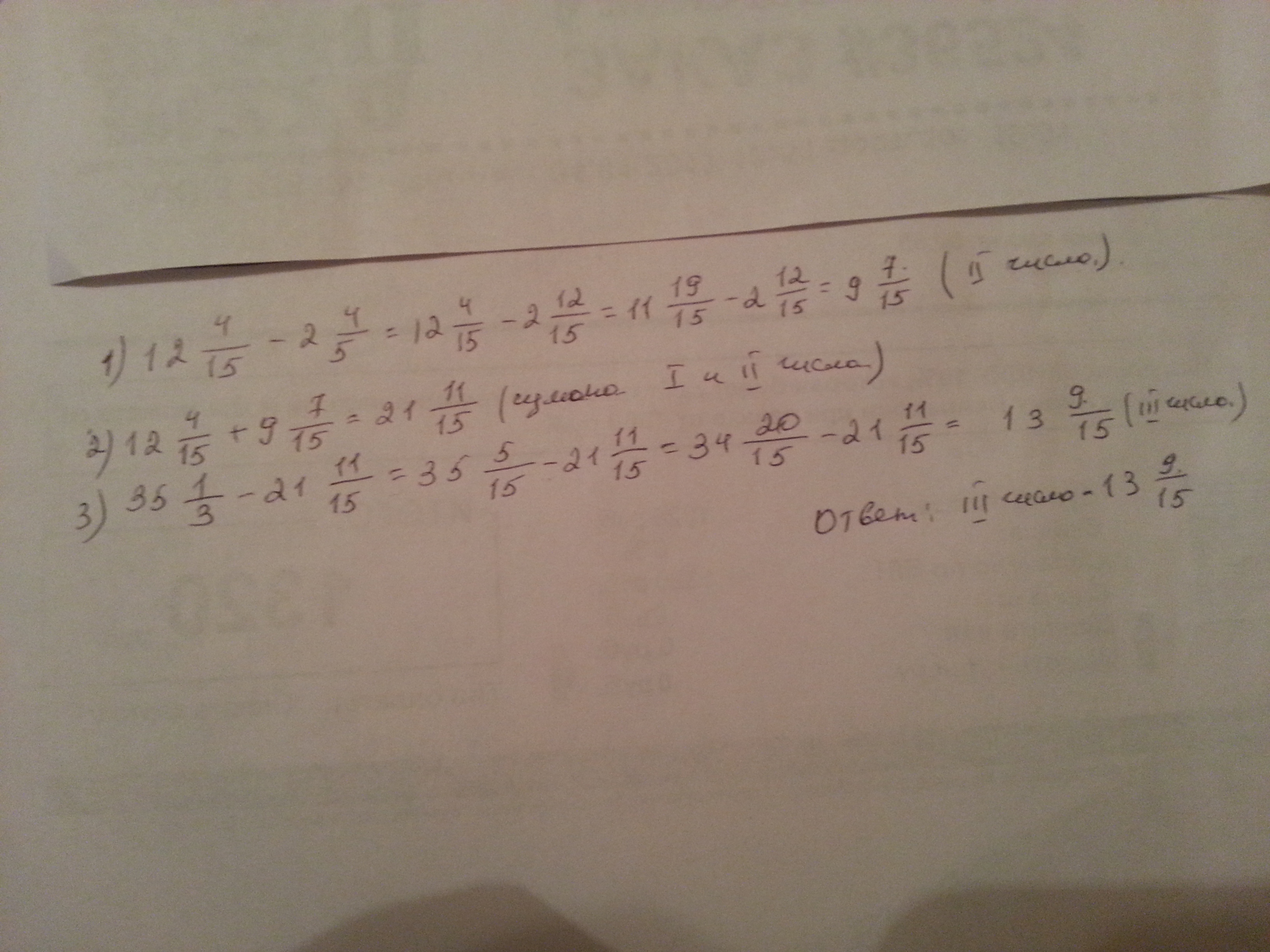 значение суммы трёх чисел равно 35 1/3.Первое число 12 4/15,второе число на 2 4/5 меньше первого числа. найдите третье число