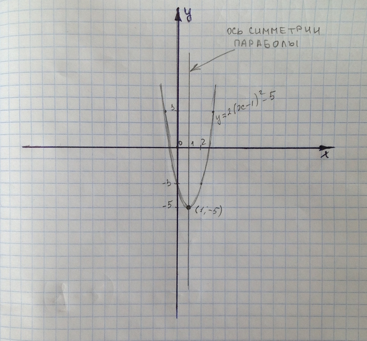 По формуле мы видим что это парабола ветвями вверх сжатая в два раза Вершина параболы находится в точке (1;-5). Уравнение оси симметрии параболы Х=1 График во вложении