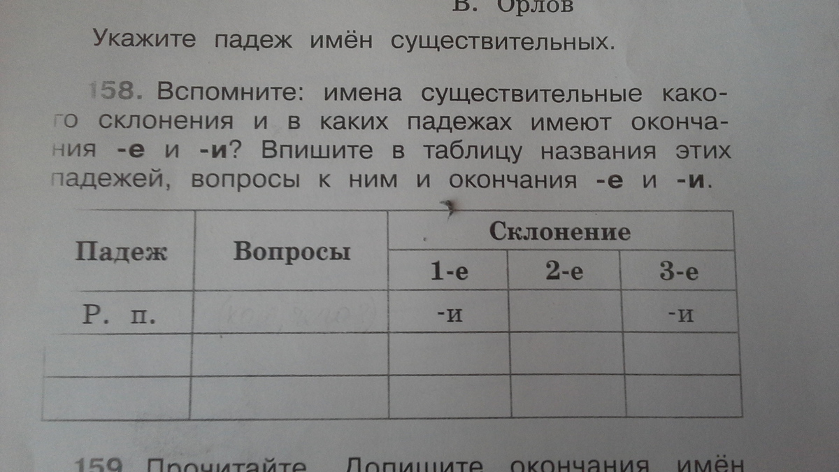 Род. Падеж: кого? Чего, 1скл (и), 2 скл (-), 3скл (и); Дательный падеж: кому?чему? 1 скл (е), 2скл (-), 3 скл (и); Предложный падеж: о ком? О чем? 1скл (е), 2 скл (е), 3 скл (и).
