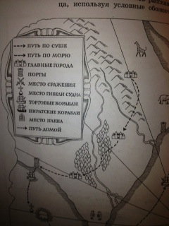Задание по Истории. 3 класс -нужно составить рассказ от имени купца по карте, используя условные обозначения: путь по суше путь по морю главные города порты место сражения место гибели судна торговые корабли пиратские корабли место плена путь домой