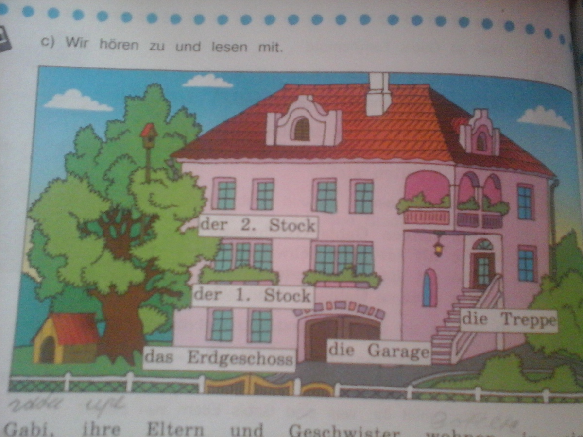 На картине изображён розовый здание, крыша у дома красная,,в этом здании есть окна,рядом с ним стоит большое зелёное дерово, а рядом с деревом есть будка, здание ограждено забором)