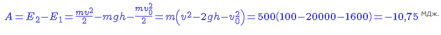 Планер массой 500 кг на высоте 1000 м имеет скорость 40 м/с, а приземляется со скоростью 10 м/с. Определить работу силы сопротивления воздуха при спуске.