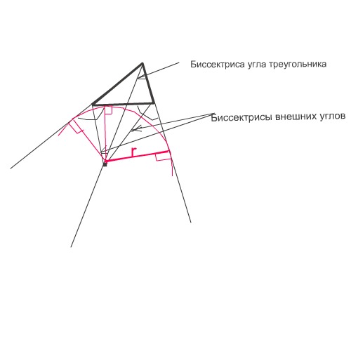 Радиусом ее будет отрезок перпендикуляра, проведенного из центра окружности к стороне треугольника или к ее продолжению.