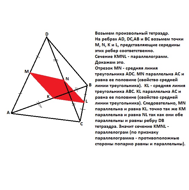 Отрезок MN - средняя линия треугольника АDC. МN параллельна АС и равна ее половине (свойство средней линии треугольника). KL - средняя линия треугольника АВС. KL параллельна АС и равна ее половине (свойство средней линии треугольника). Следовательно, MN параллельна и равна KL. точно так же KM параллельна и равна NL так как они обе параллельны и равны ребру DB тетраэдра. Значит сечение KMNL - параллелограм (по признаку параллелограмма - противоположные стороны равны и параллельны).