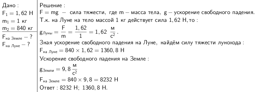 дано :m=840 кг;Fл=1,62 Н,m1=1 кг. На Земле на тело действует сила тяжести F=mg=840*10=8400 Н. Найдем на Луне g1=F1/m1=1,62/1=1,62 Н/кг,тогда на тело на Луне будет действовать сила тяжести F '=mg1=840*1,62=1360,8 Н