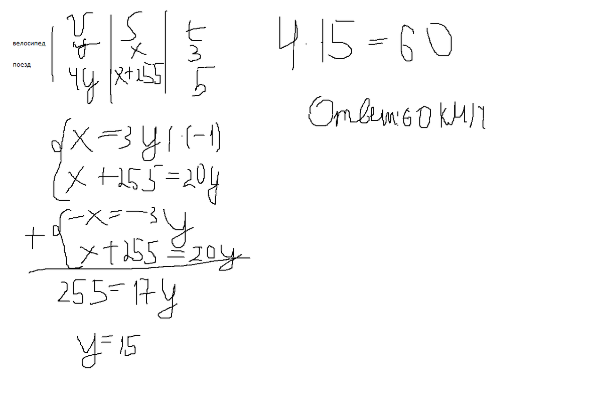 мне задали задачу Ян сначала 3 ч ехал на велосипеде ,а затем 5 ч поездом, причём поездом он проехал на 255 км больше. Найдите скорость движение Яна поездом , учитывае,что она в 4 раза юольше скорости движения на велосипеде