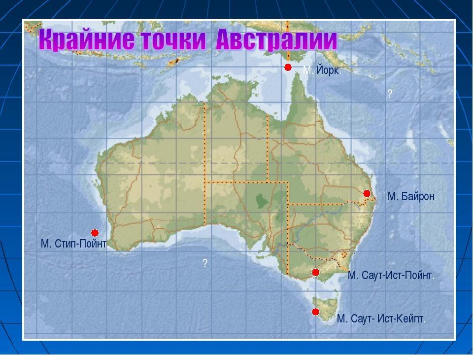 определите географические координаты крайних точек австралии измерьте расстояние между ними и дайте им физико географическую характеристику