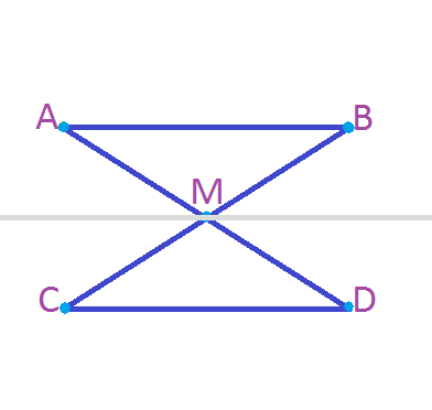 То, что вы описали, выглядит примерно так, как на картинке. А так, как АВ и СD равны, то и ВD и АС тоже равны. А если ещё и учесть, что части изображения относительно серой линии равны, то можно уверенно говорить, что треугольники АВМ и СDМ равны.