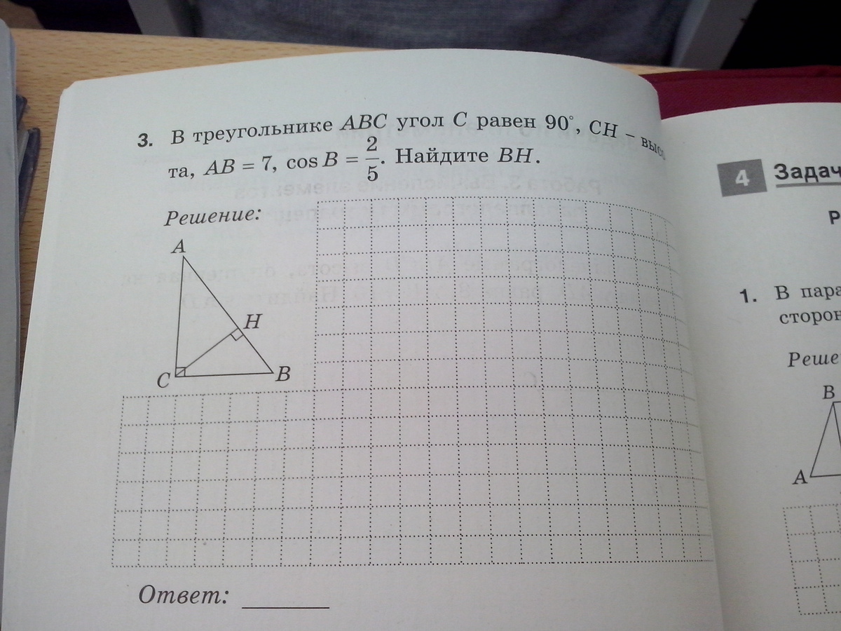 Из треугольника АВС: BC=AB*cosB=7*2/5=14/5. А из треугольника ВСН: ВН=ВС*cosB=14/5*2/5=28/25.
