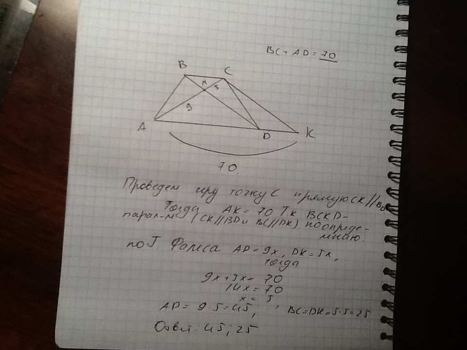 Точка пересечения диагоналей трапеции делит одну из них на отрезки длиной 5 см и 9 см . Найдите основания трапеции , если их сумма равна 70 см