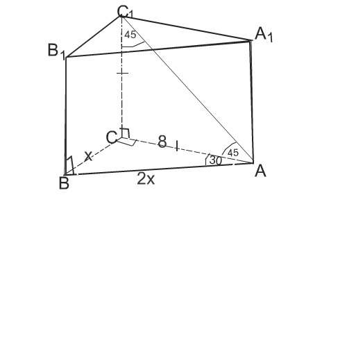 Высота равна 8, т.к. диагональ грани со сторонами, равными высоте и катету=8, образует со сторонами грани угол 45 градусов, и стороны грани равны.