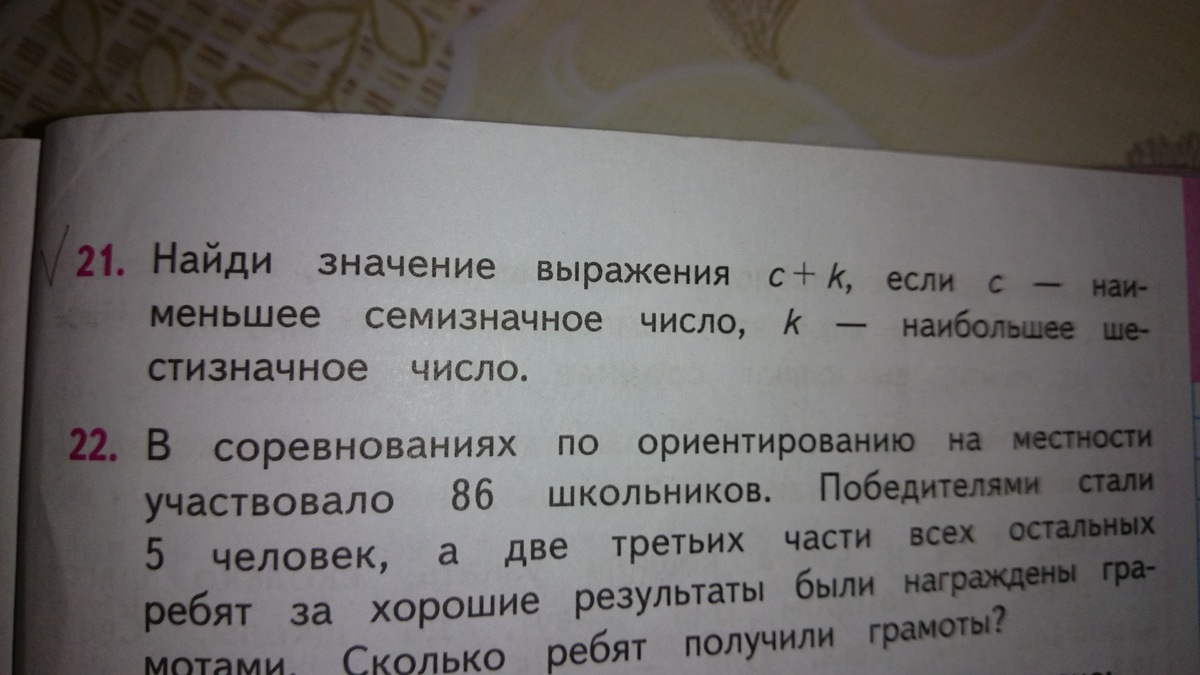 найди значение выражения c+k,если с - наименьшее семизначное число,k- наибольшее шестизначное число.