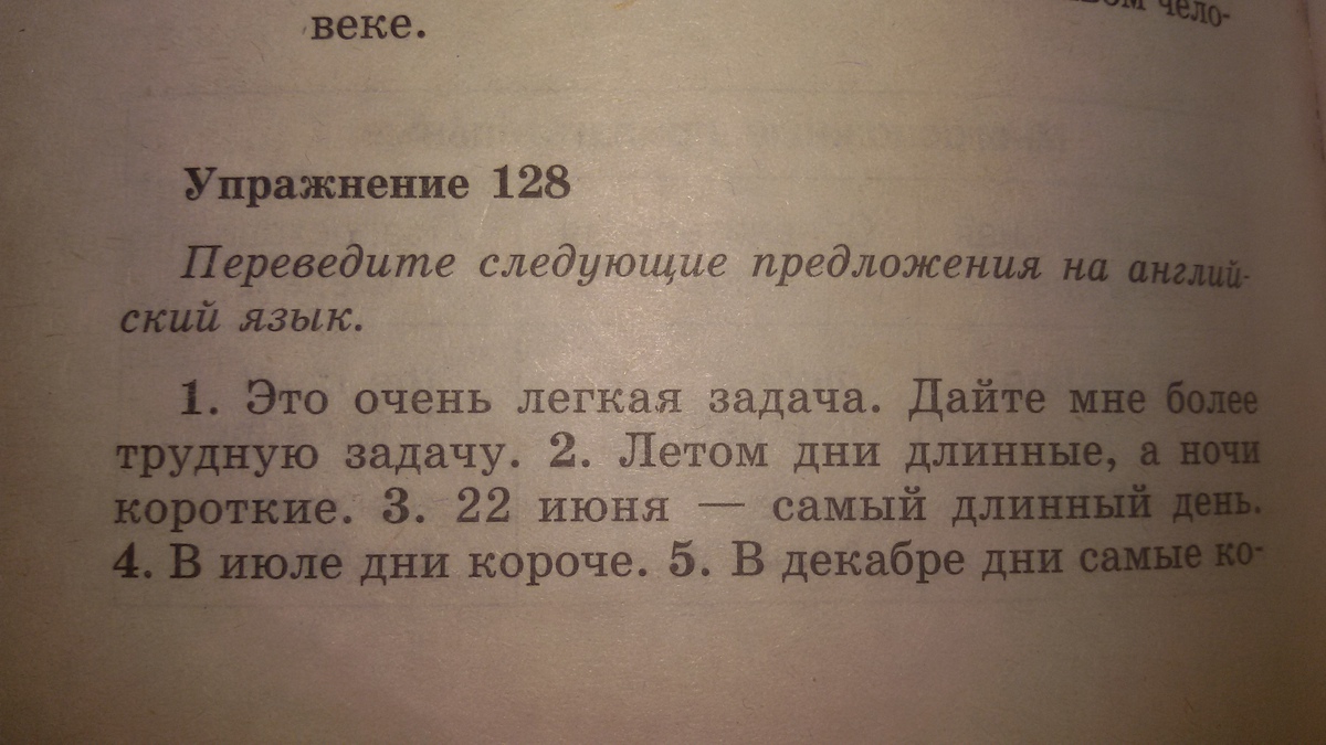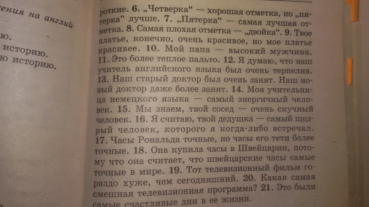 1.This is a very easy task. Give me a more difficult task. 2. In summer the days are long and the nights are short. 3. June 22 - the longest day. 4. in December, the shortest day. 6. "Four" - a good mark, but "five" better. 7. "Five" - the best mark. 8. The worst mark - "deuce". 9. What is your dress, of course, very beautiful, but my dress is beautiful. 10. My dad - a tall man. 11.This warmer coat. 12. I think that our English teacher was very patient .13 Our old doctor was very busy. Our new doctor even busier. 14. My German teacher - the most energetic person. 15. We know your neighbor - a very boring person. 16. I think your grandfather the most generous person I when - ever met.