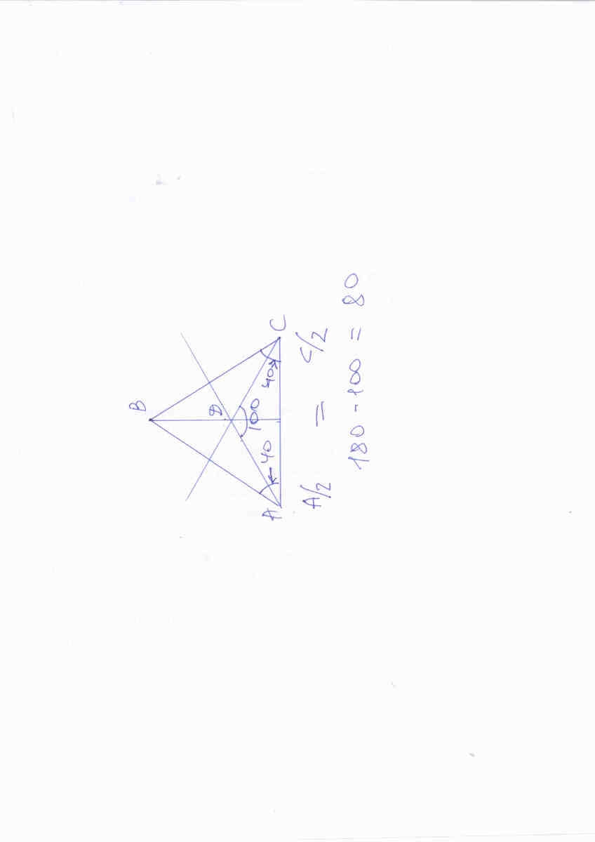 Получаешь еще внутри равнобедренный треугольник ADB. Сумма углов треугольника = 180. углы при основании AB равны между собой. 180-100=80/2=40