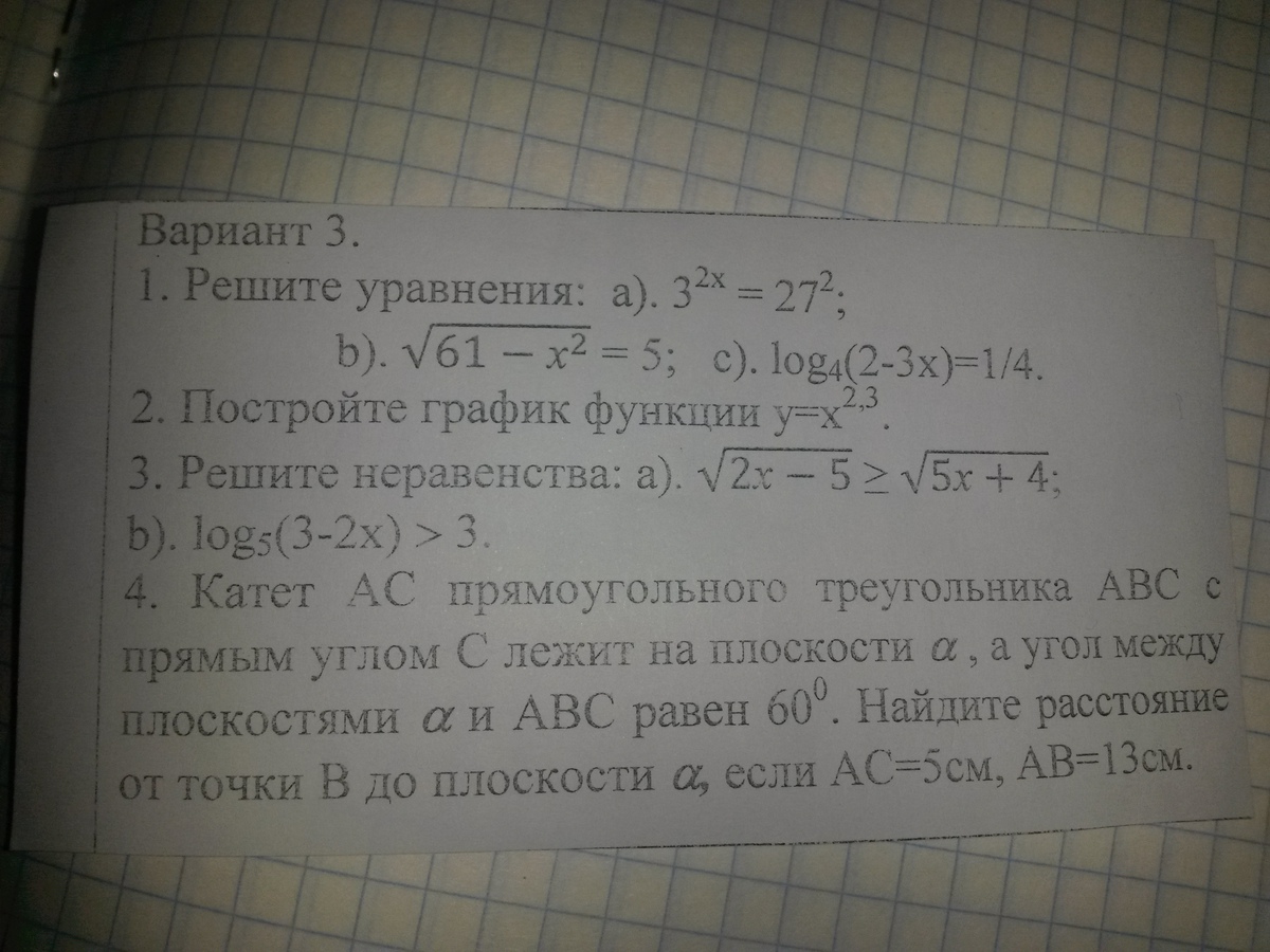 4. Разбираемся с чертежом. Всё дело в том, что по теореме о 3-х перпендикулярах легко показать угол между плоскостью Δ АВС и данной плоскостью. Если ВО - это перпендикуляр из точки В на плоскость, то угол, который нам дан - это угол ВСО. Именно он =60. А искать надо ВО. Ищем из ΔВСО. В нём есть угол 60, 90, значит, и 30. Катет, лежащий против угла 30 равен половине гипотенузы ВС. А гипотенузу ВС ищем из другого ΔАВС по т. Пифагора ВО^2 = 144 - 25 =169 ⇒ BC = 13. BO = 13/2 = 6,5.