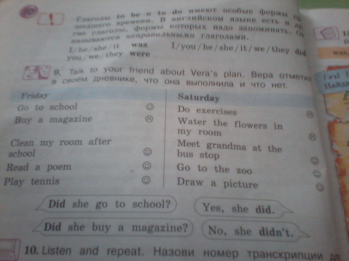DID SHE DO TO SCHOOL? --- YES, SHE DID. DID SHE BUY A MAGAZINE? --- NO, SHE DIDN"T. DID SHE CLEAN MY ROOM AFTER SCHOOL? --- YES, SHE DID. DID SHE READ A POEM? --- NO, SHE DIDN"T. DID SHE PLAY TENNIS? --- YES, SHE DID. DID SHE DO EXERCISES? --- NO, SHE DIDN"T. DID SHE WATER THE FLOWERS IN MY ROOM? --- YES, SHE DID. DID SHE MEET GRANDMA AT THE BUS STOP? --- NO, SHE DIDN"T. DID SHE GO TO THE ZOO? --- YES, SHE DID. DID SHE DRAW A PICTURE? --- NO, SHE DIDN"T ☻☻☻
