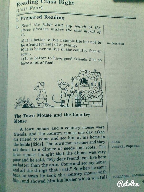 В первом тексте говорится про полевую и городскую мышь. Городская мышь пришла в гости к полевой, но ей не нравится бедная обстановка и простая пища полевой мыши. Полевая мышь идет в гости к городской, ей нравится еда, но городскую мышь постоянно беспокоят [крысы? текст смазан, не видно]. Полевая мышь вернулась домой, сказав что лучше жить в бедноте да покое, чем в богатстве и опасности.