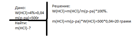 какие массы поваренной соли и воды надо взять для приготовления 500г раствора с массовой долей в нём 4%. решите плиз эту задачу с дано и решением очь надо)