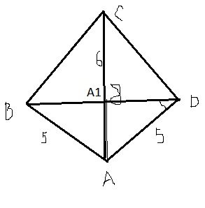 1.Проведем высоту из вершины равностороннего треугольника(ABD) к стороне BD - в точку(A1).AB=AD=5.BD=8 значит BA1=A1D=4