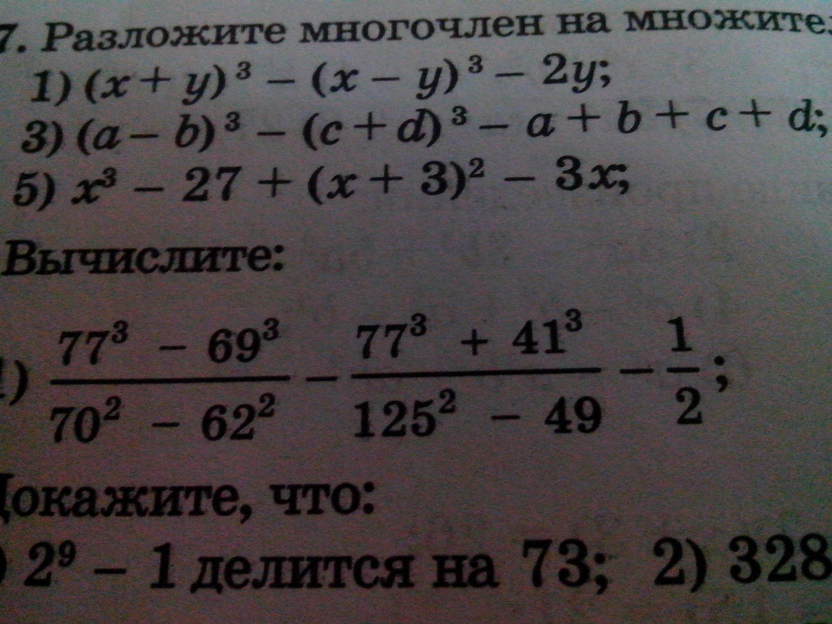 frac{77^3-69^3}{70^2-62^2} - frac{77^3+41^3}{125^2-49} - frac{1}{2} = frac{(77-69)(77^2+77cdot 69+69^2)}{(70+62)(70-62)} - frac{(77+41)(77^2-77cdot 41+41^2)}{(125-7)(125+7)}- \ - frac{1}{2} = frac{8cdot(77^2+77cdot 69+69^2) }{132cdot 8} - frac{118(77^2-77cdot 41+41^2)}{118cdot 132} - frac{1}{2} = \ = frac{77^2+77cdot69+69^2+77^2-77cdot 41-41^2}{132} - frac{1}{2} =87