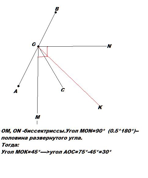 1)Луч ОК-биссектриса угла,сторонами которого являются биссектрисы смежных углов АОС и СОВ.Вычислите градусную меру угла АОС,если угол АОК равен 75