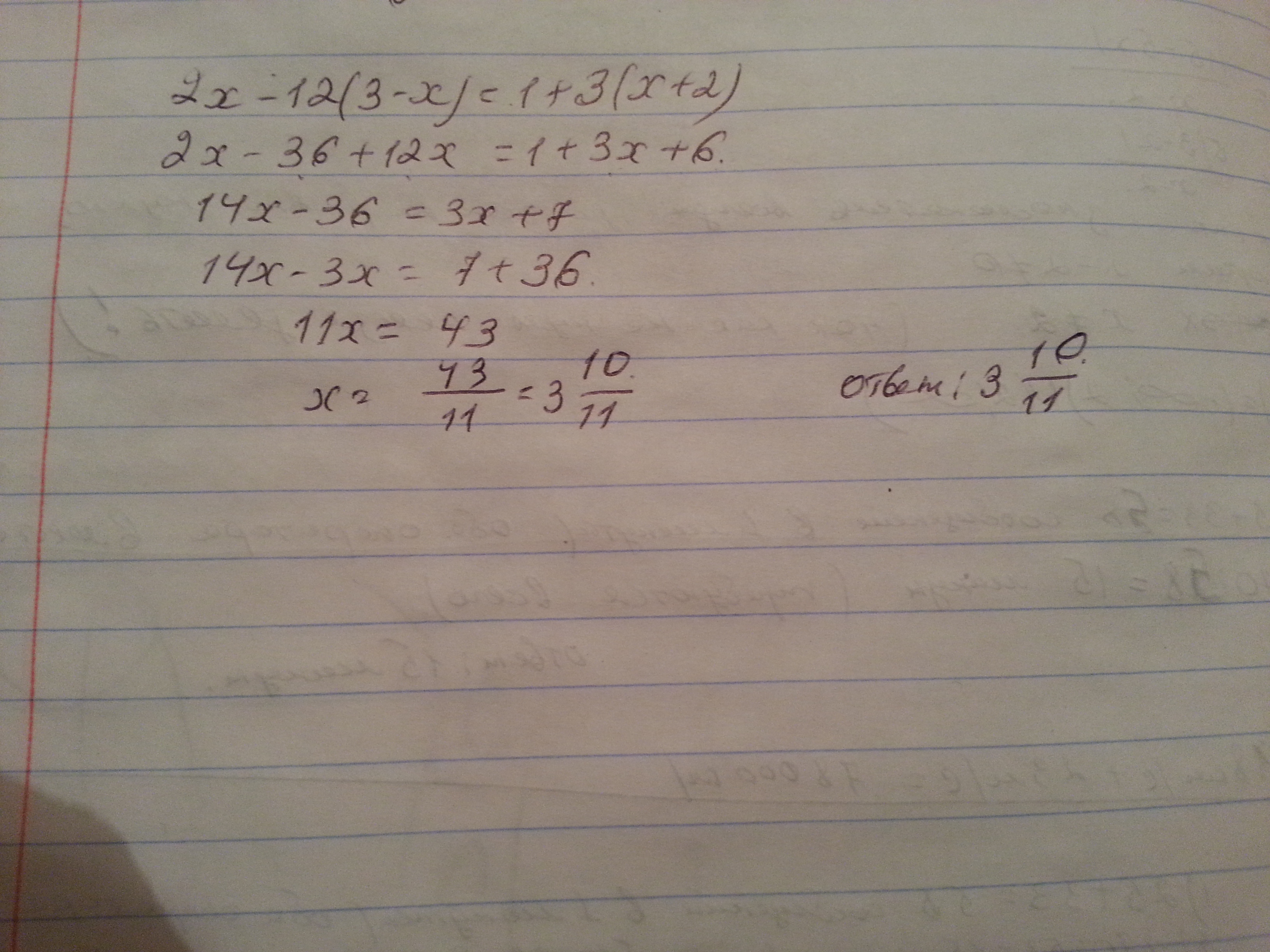 2x – 12(3 – x) = 1 + 3(x + 2),