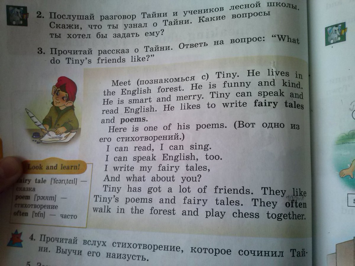 познокомся с тиней он живёт в английском лесу он весёлый и добрый он умеет читать и писать на английском он пишет племя вот одно из них я умею читать я умею петь я умею говорить на английском тоже я пишу свои сказки а что ты тиней имеет много друзей все любят его поемы и сказки он часто гуляет в лису и играет с ними