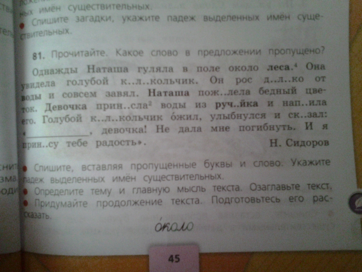 Однажды Наташа гуляла в поле около леса.Она увидела голубой колокольчик.Он рос далеко от воды и совсем завял.Наташа пожалела бедный цветок.Девочка принесла воды из ручейка и напоила его.Голубой колокольчик ожил,улыбнулся и сказал:"Спасибо,девочка!Не дала мне погибнуть.И я принесу тебе радость".