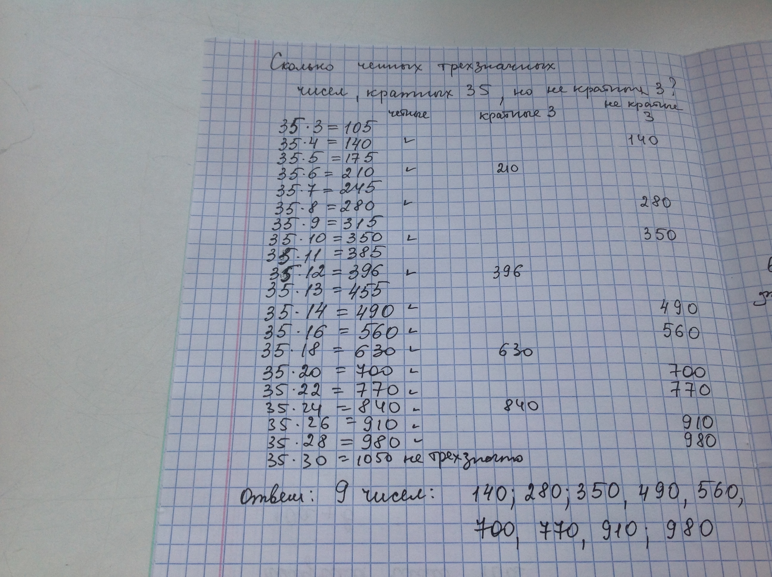 1)Сколько чётных трёхзначных чисел, кратных 35, но не кратных 3? 2)Сколько двузначных чисел, которые уменьшаются в 13 раз при отбрасывании последней цифры? 3)Найдите наименьшее четырёхзначное число, при делении которого на 5 получается в остатке 4, при делении на 6 – в остатке 5, а при делении на 7 – в остатке 6.