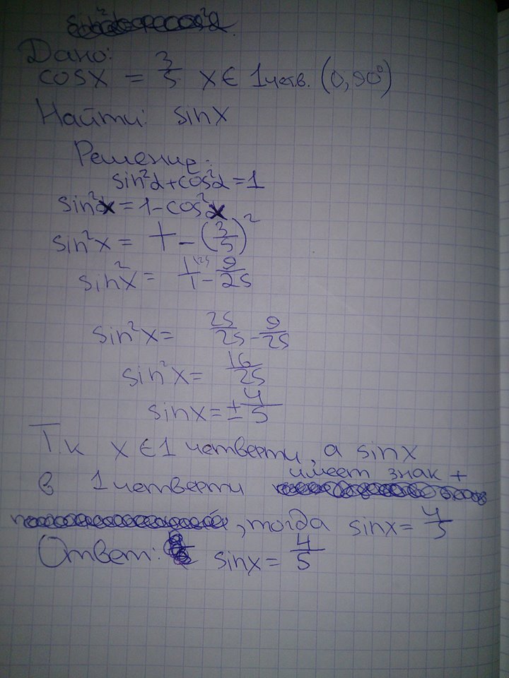 При помощи основного тригонометрического тождества найдите sinx, если cosx = 3/5, x є I четверти