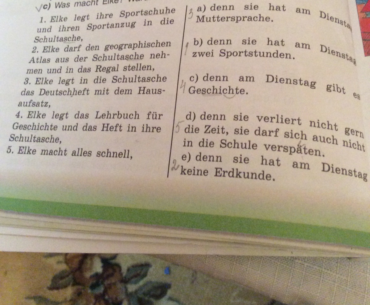 3) Эльке кладет в портфель тетрадь по немецкому с домашним сочинением, потому что у нее во вторник родной язык.