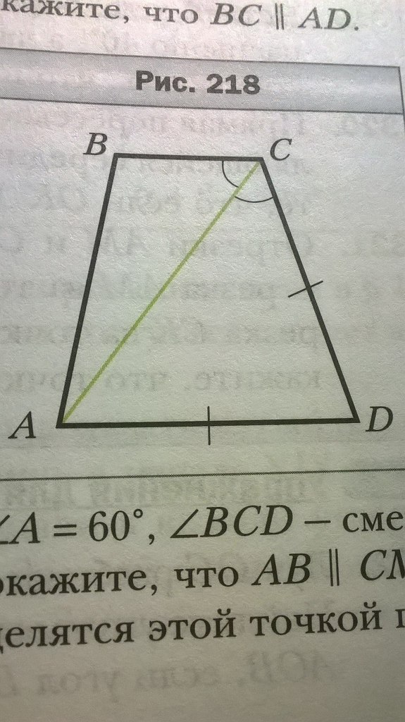 На рисунке 218 угл ACB = углу ACD, AD = CD. Докажите, что BC параллельна AD.