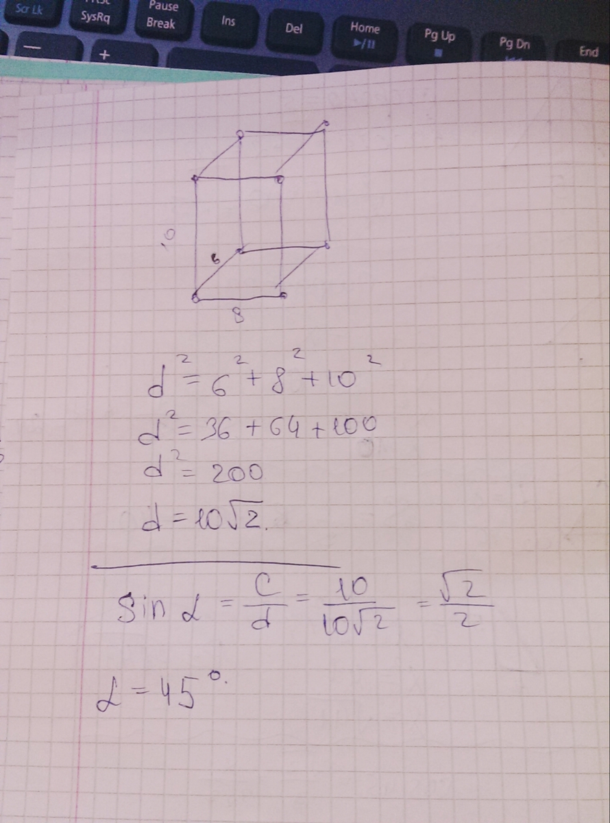 Нарисуйте рисунок плиззз. :В прямоугольном параллелепипеде измерения равны 6;8;10. Найти диагональ пар-педа и угол между диагональю пар-педа и плоскостью его основания