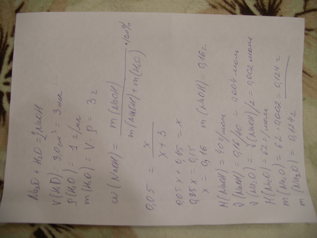 ОЧЕНЬ НУЖНО!Вычислите массу оксида натрия,который необходимо добывить к воде объёмом 3,00см³,чтобф получить раствор с массовой долей щелочи,равной 5,00%.