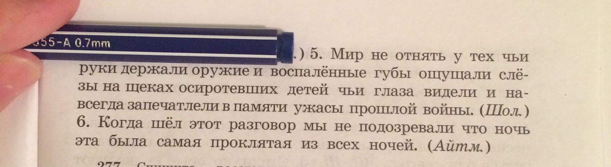 Мир не отнять (сказ.) у тех, чьи руки ( подл.)держали(сказ.) в руках оружие и воспаленные губы (подл.) ощущали ( сказ.)соленые слезы на щеках осиротевших детей, чьи глаза (подлеж.) видели (сказ.) и навсегда запечатлели (сказ)в памяти ужасы прошлой войны. Когда шел (сказ.).) разговор(подл.) , мы (подл.) не подозревали,(сказ.) что эта ночь(подл.) была самая проклятая (сказ.)из всех ночей.