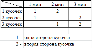 На сковороде помещается два кусочка хлеба.На поджаривание кусочка с одной стороны требуется 1 минута.Как поджарить за 3минуты три кусочка хлеба с обоих сторон
