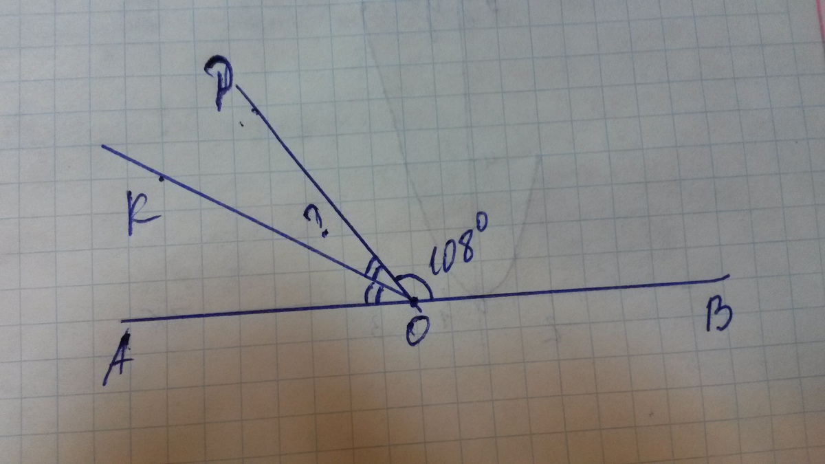 На прямой AB отмечена точка O. Найдите величину угла DOK, если OK-биссектриса угла AOD, угол DOB=108`. Ответ дайте в градусах.