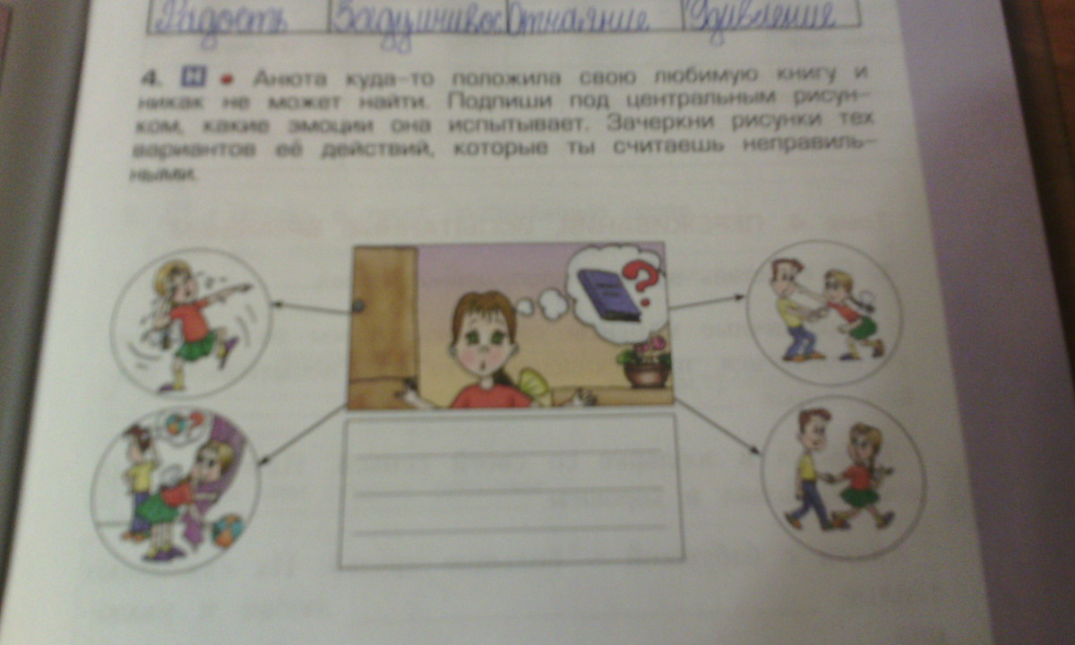 1)Анюта куда-то положила свою любимую книгу и никак не может ее найти. Подпиши под центральным рисунком, какие эмоции она испытывает. зачеркни рисунки тех