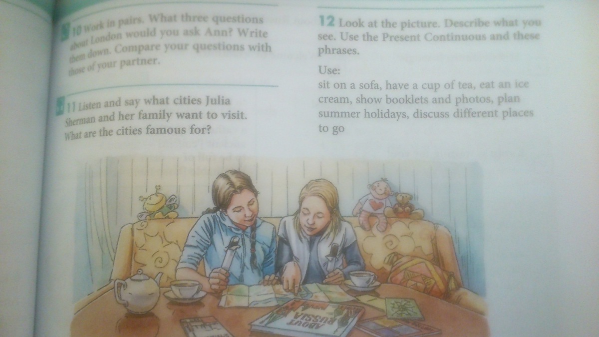 2 girls are sitting on a sofa. They are having a cup of tea and eating an ice cream. A girl with blond hair is showing booklets and photos to another girl. Probably they are planning their summer holidays and discussing different places to go.